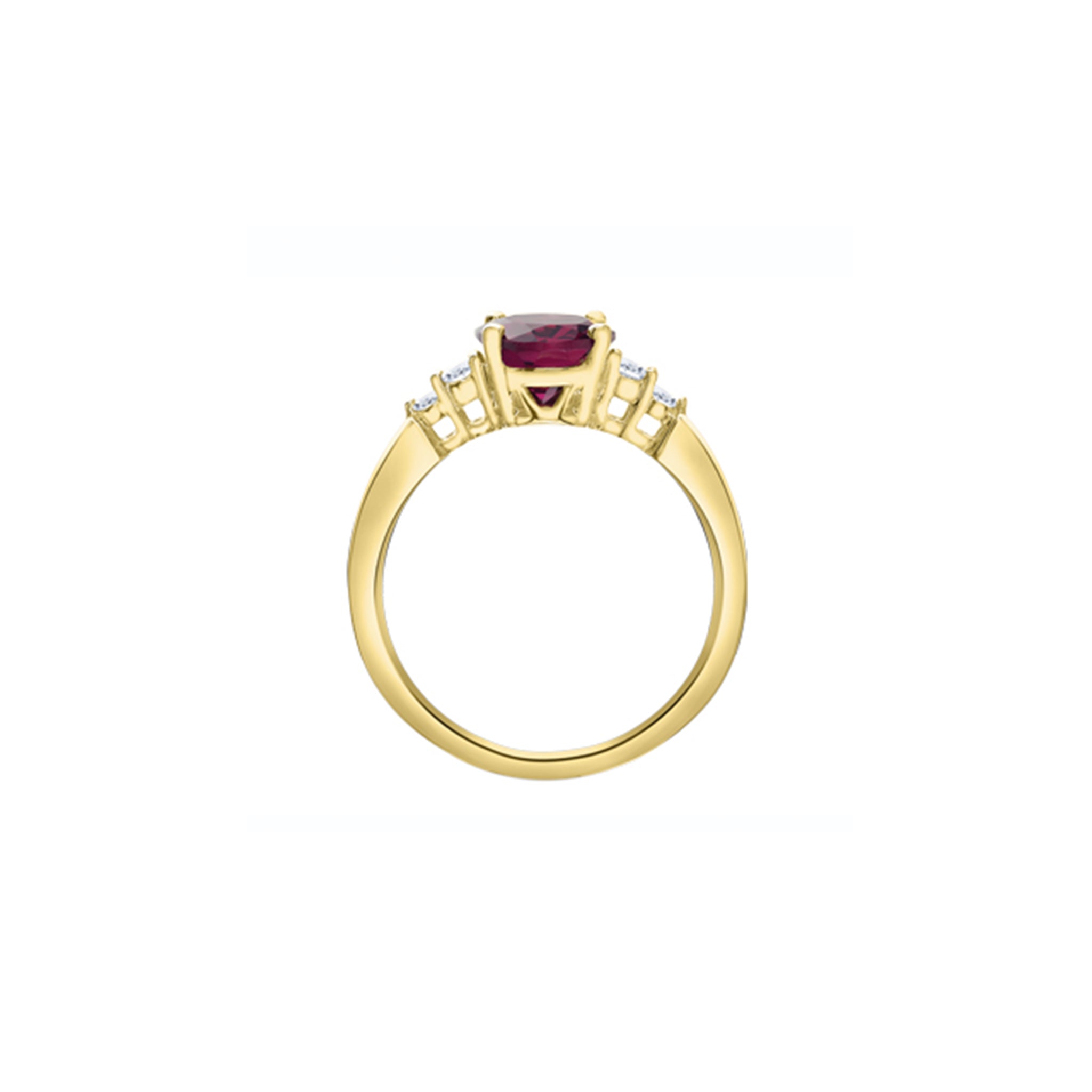 This refined ring features a captivating rhodalite garnet set in lustrous 10K yellow gold, accented with 0.11 carats of Canadian diamonds. A sophisticated choice for those who appreciate distinctive gemstones and responsible sourcing.