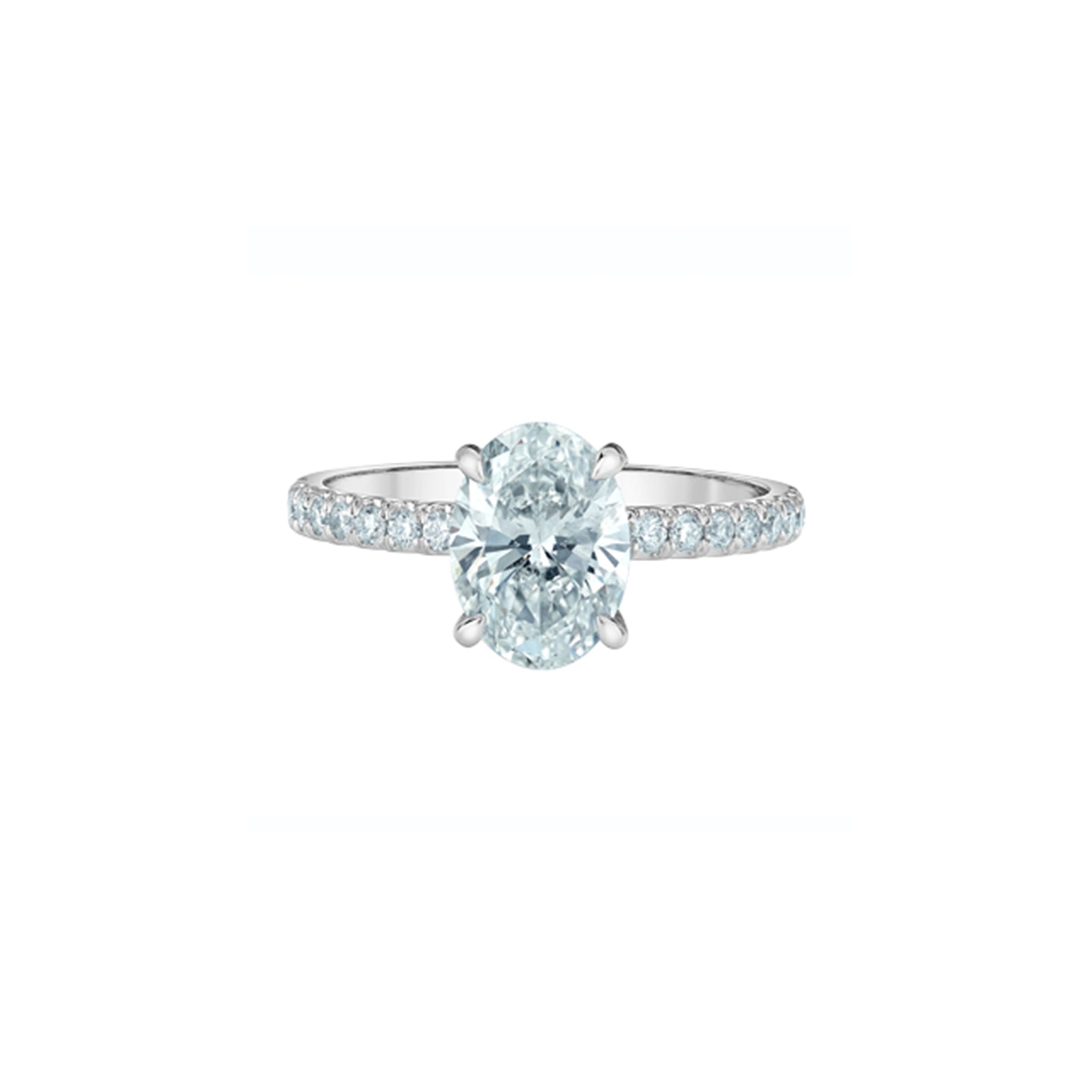 This ring is expertly crafted from 14KT white gold and showcases a precisely shaped lab-created oval diamond. It features a hidden halo and additional diamonds set along the band for enhanced brilliance.
